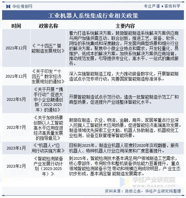 国度各级部分下发的计谋性文件为工业机械人系统集成行业的成长供给了优良的政策,按照终端客户的分歧需求,可进入华经谍报网搜刮查看。